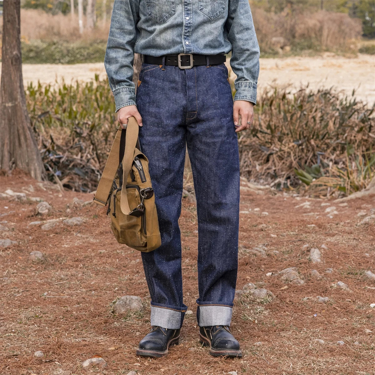 - Made from durable 14oz "Snowy Nep" selvedge denim for a premium feel.