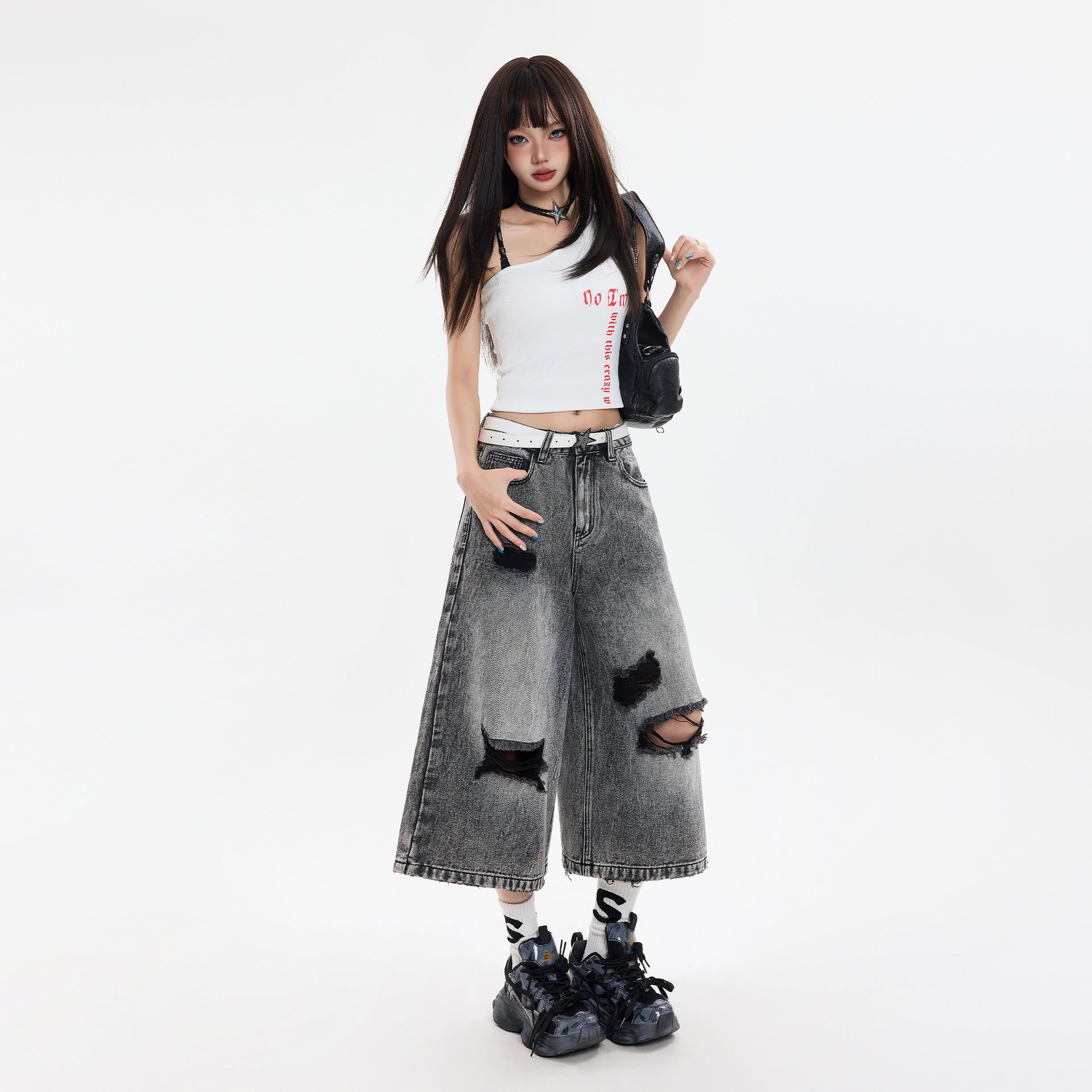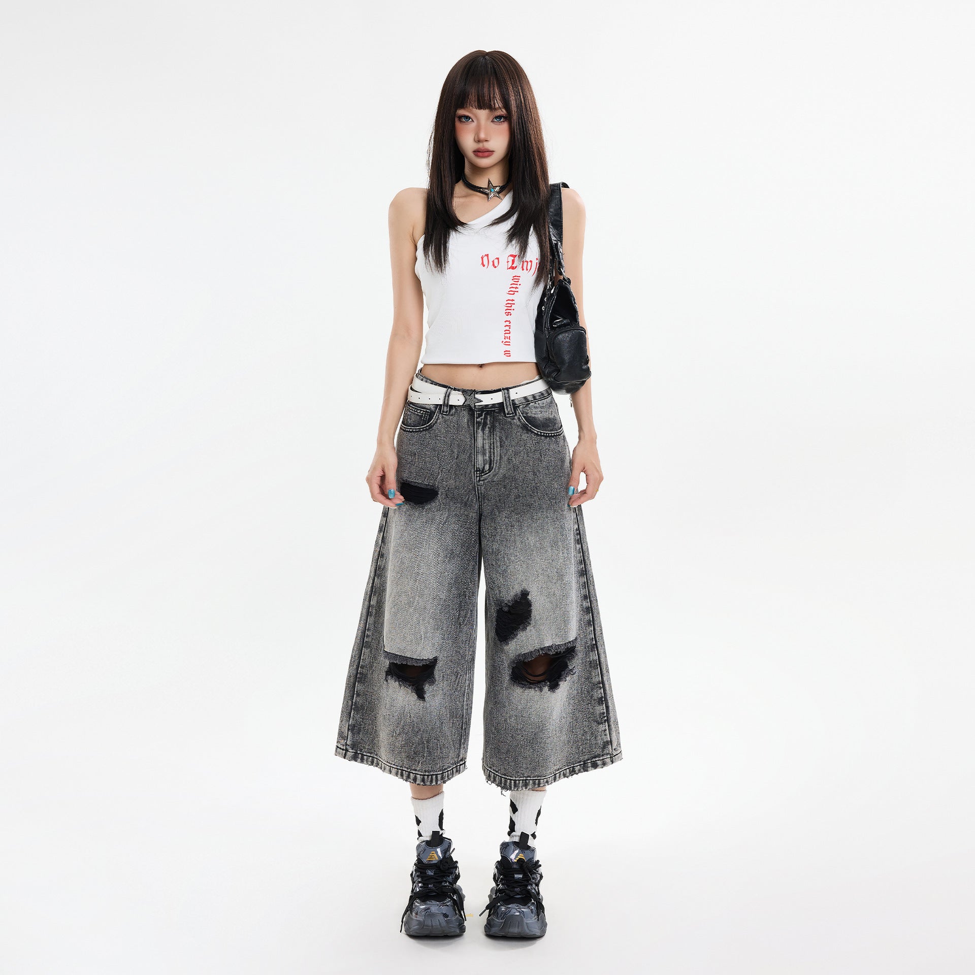 Elevate your street style with our Black Gray Hole Seven-Point Denim Pants. These vintage-inspired wide-leg straight leg pants blend comfort and trend seamlessly, making them a must-have in your wardrobe.