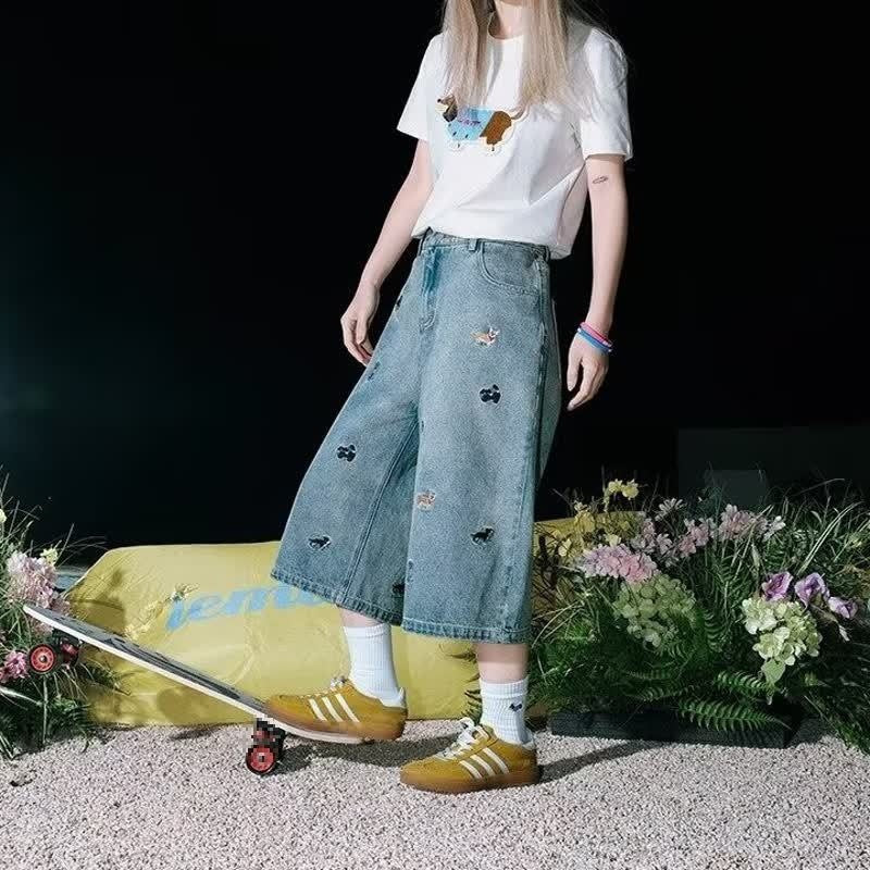 Cartoon Dog Embroidery Washed Five-Quarter Denim Shorts for Men and Women