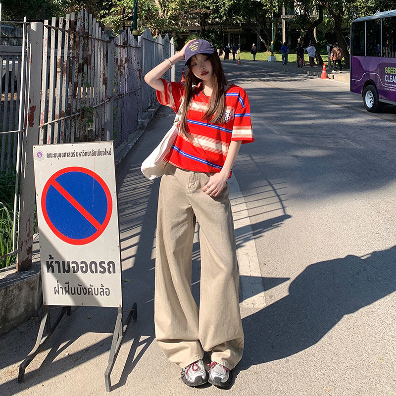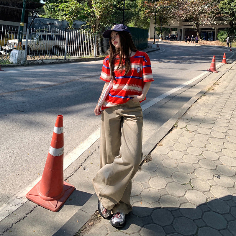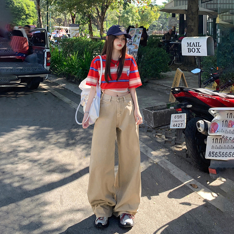 Khaki Denim Pants for Women - Loose Fit, High Waist, Straight Leg, Wide Leg Trousers