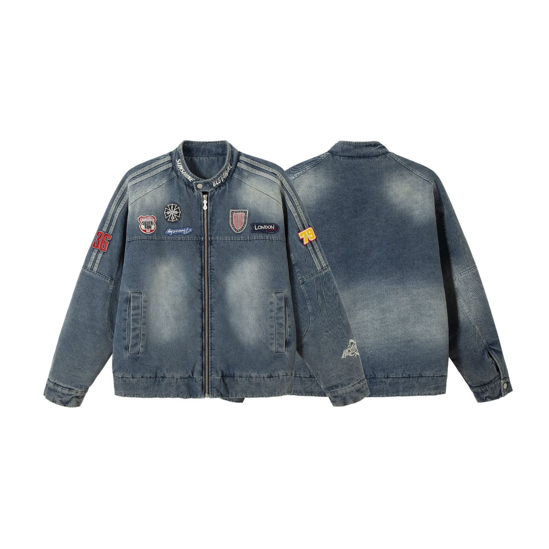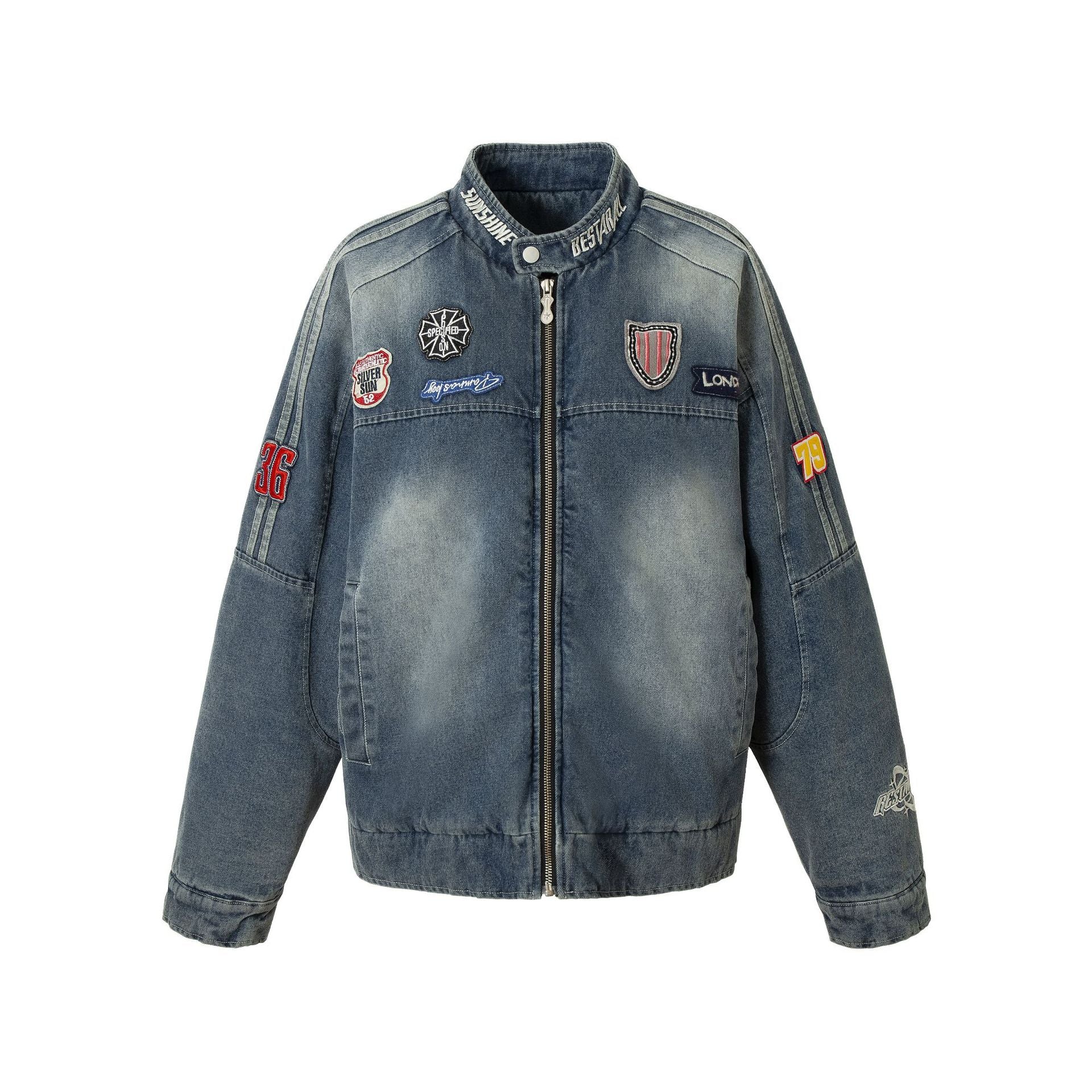 Men's Distressed Badge Denim Cotton Motorcycle Jacket, Stylish and Warm Outerwear