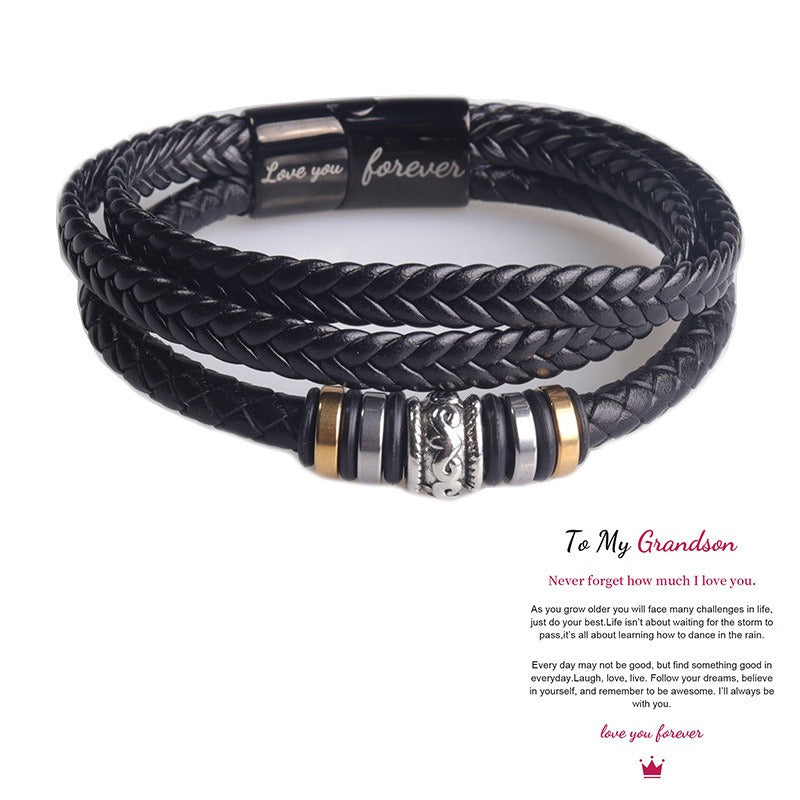 This Men's Leather Bracelet combines rugged elegance with a timeless design. Crafted from premium black leather cord and stainless steel, it features a secure magnetic clasp and an engraved message of affection, making it a perfect gift for loved ones or a stylish addition to your own collection.