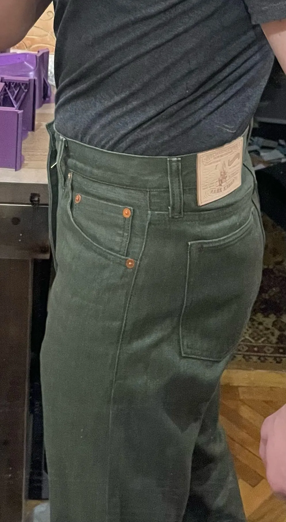 - Color: Olive Green No. 107, featuring a unique vulcanization process for slower fading compared to traditional indigo denim.