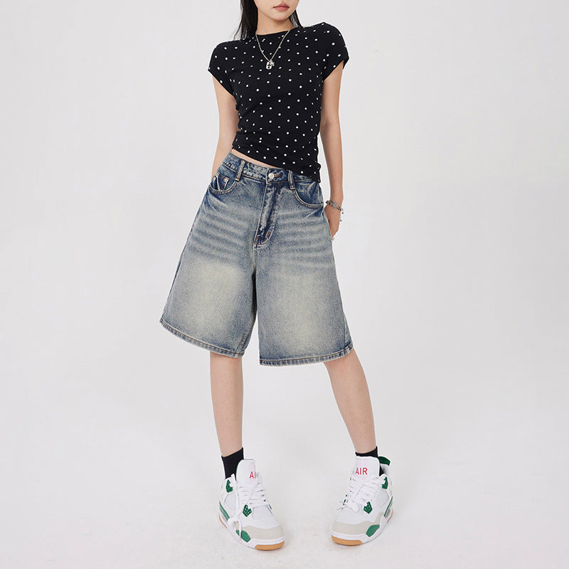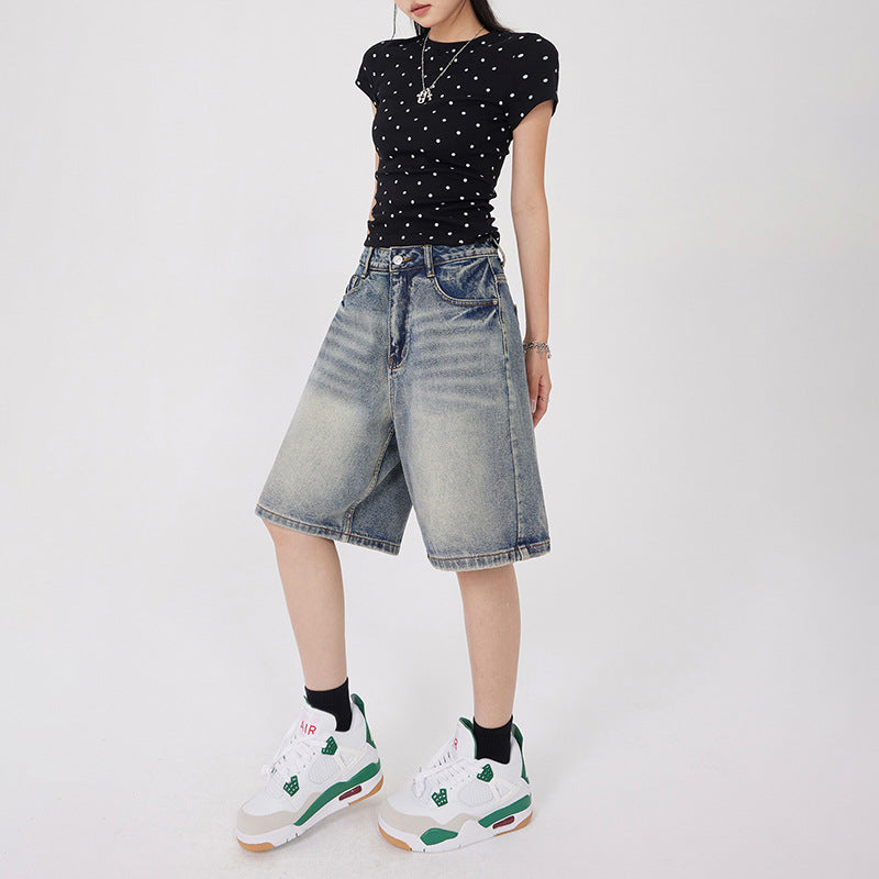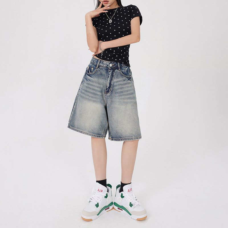 Orange Silk Women's Vintage Washed Denim Shorts Five-Quarter Pants