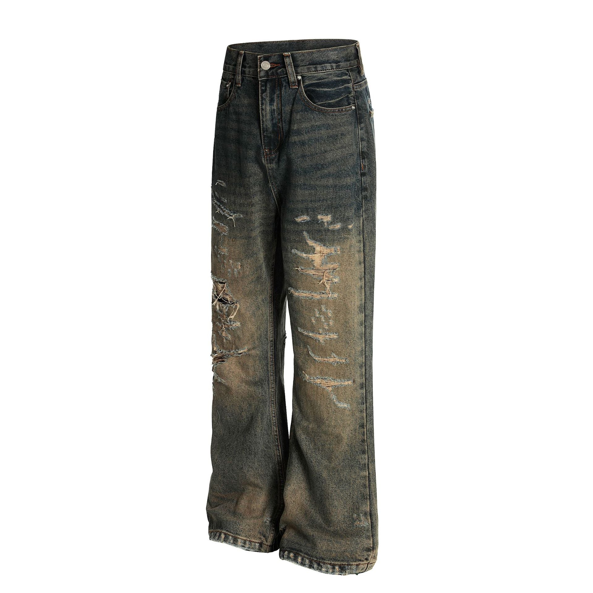 Retro Washed Dirty Dyed Denim Straight Leg Micro Flared Pants