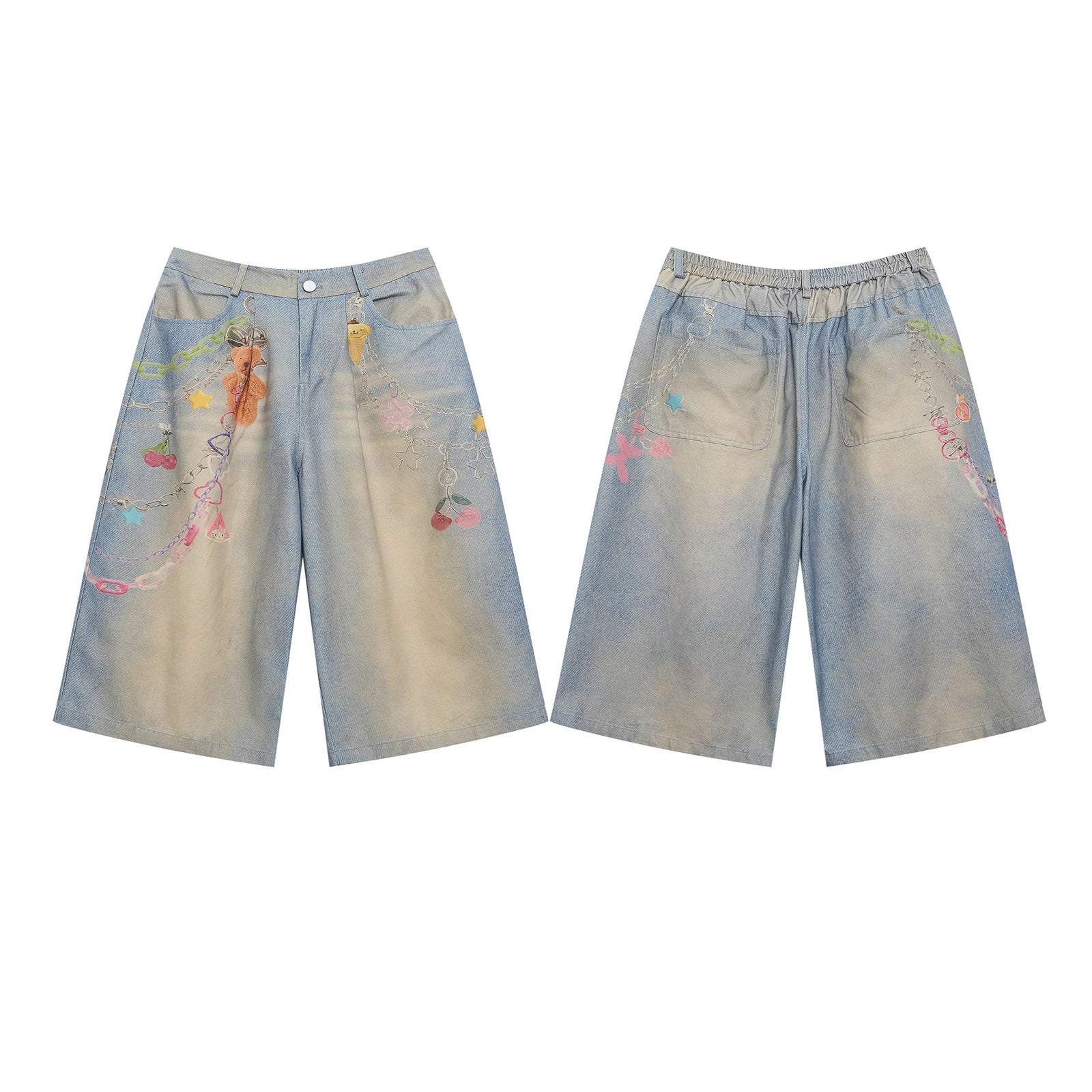Retro Cartoon Chain Print Loose Wide-Leg Mid-Length Denim Shorts for Men