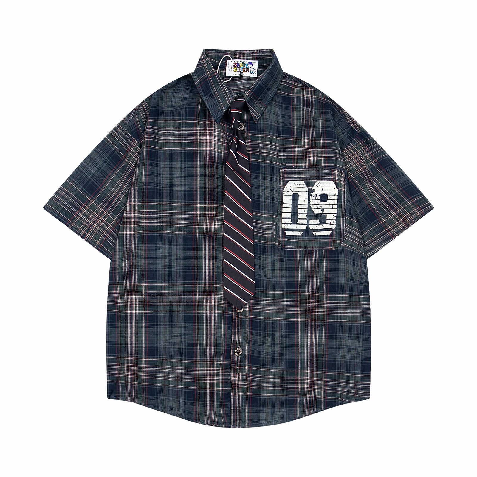 Retro College Style Plaid Short Sleeve Shirt with Tie for Men and Women