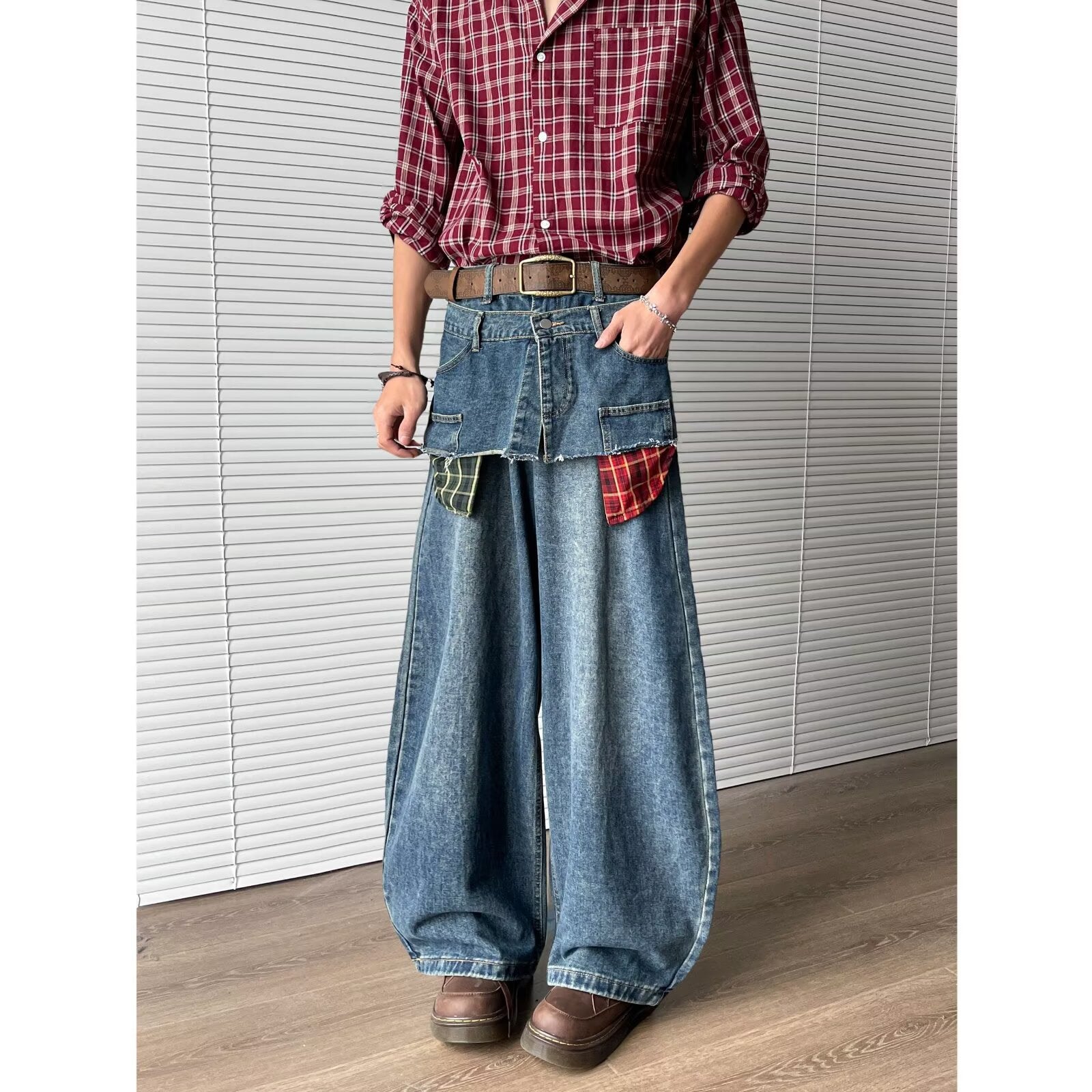Retro Fake Two-Piece Checkered Patchwork Jeans for Men - Summer Style