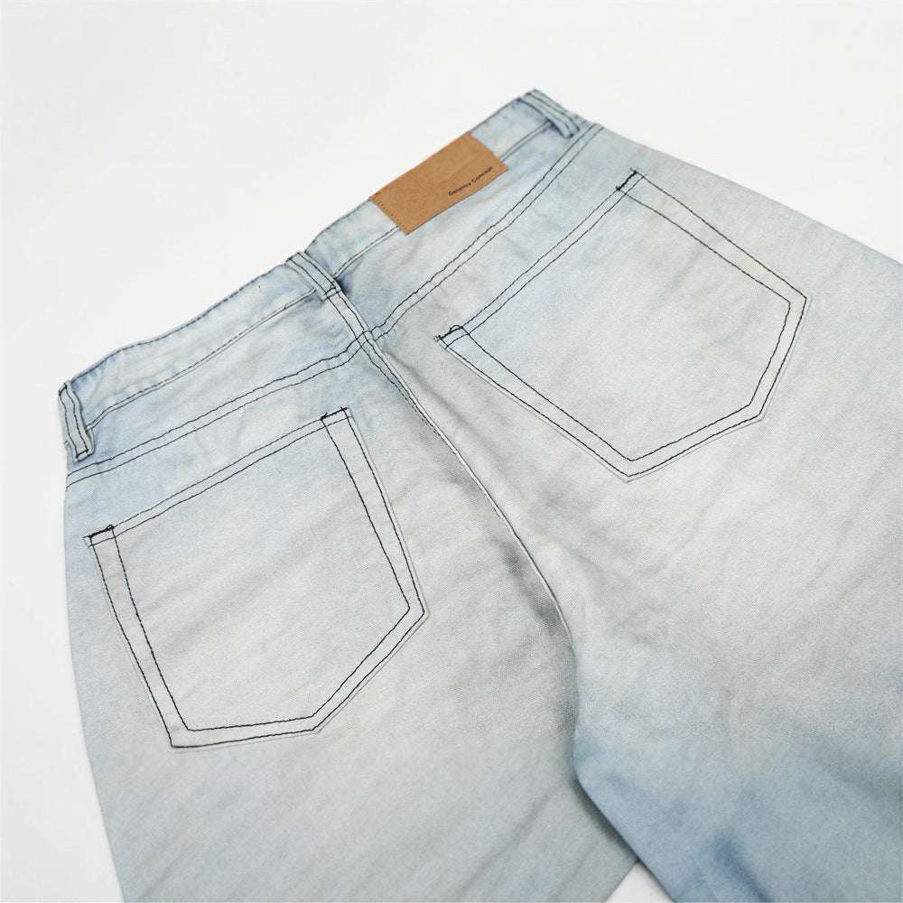 Men's Retro Denim Jeans, Distressed Washed Straight Leg, Loose Fit, Wide Leg Pants
