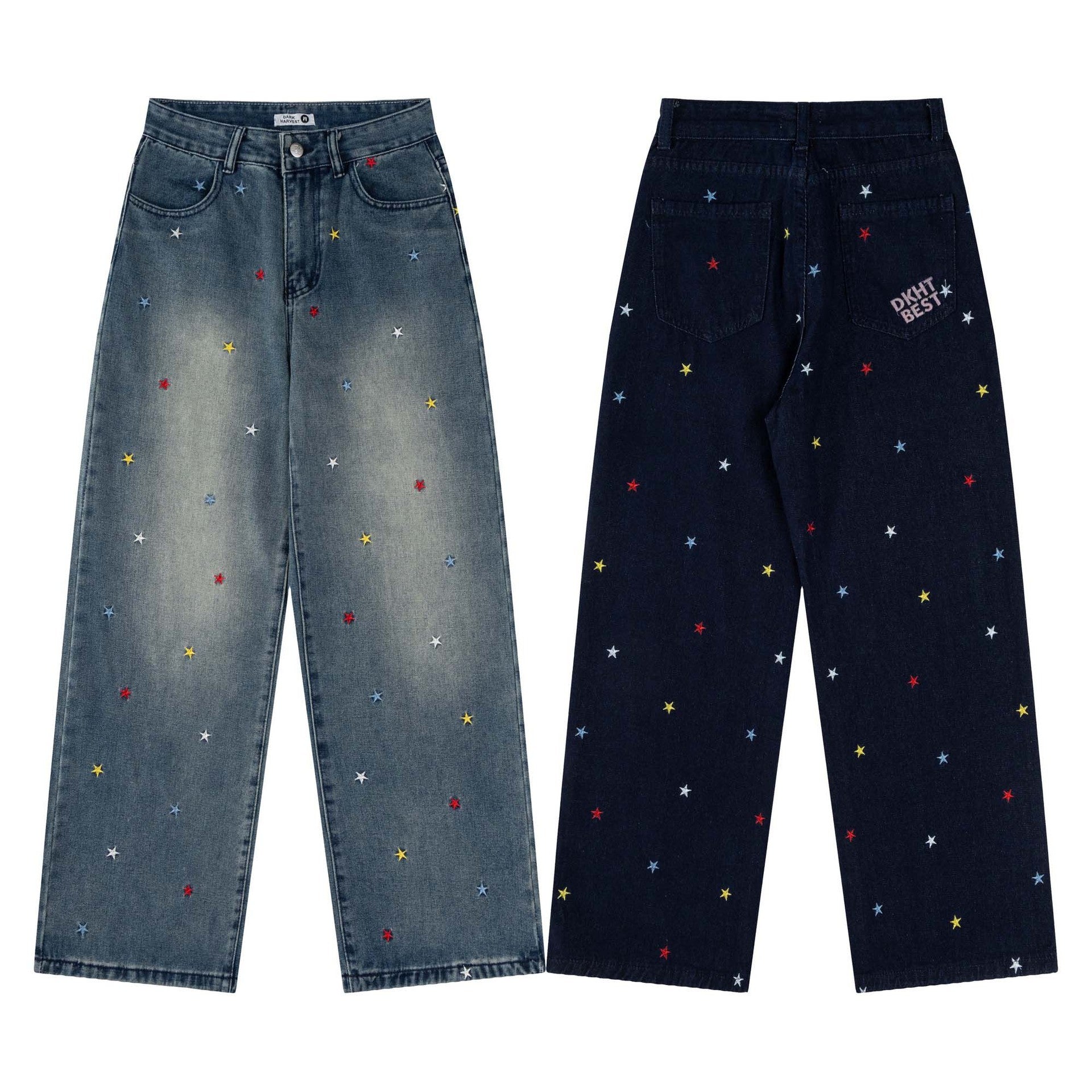 Retro Washed Star Letter Embroidered Denim Pants for Unisex