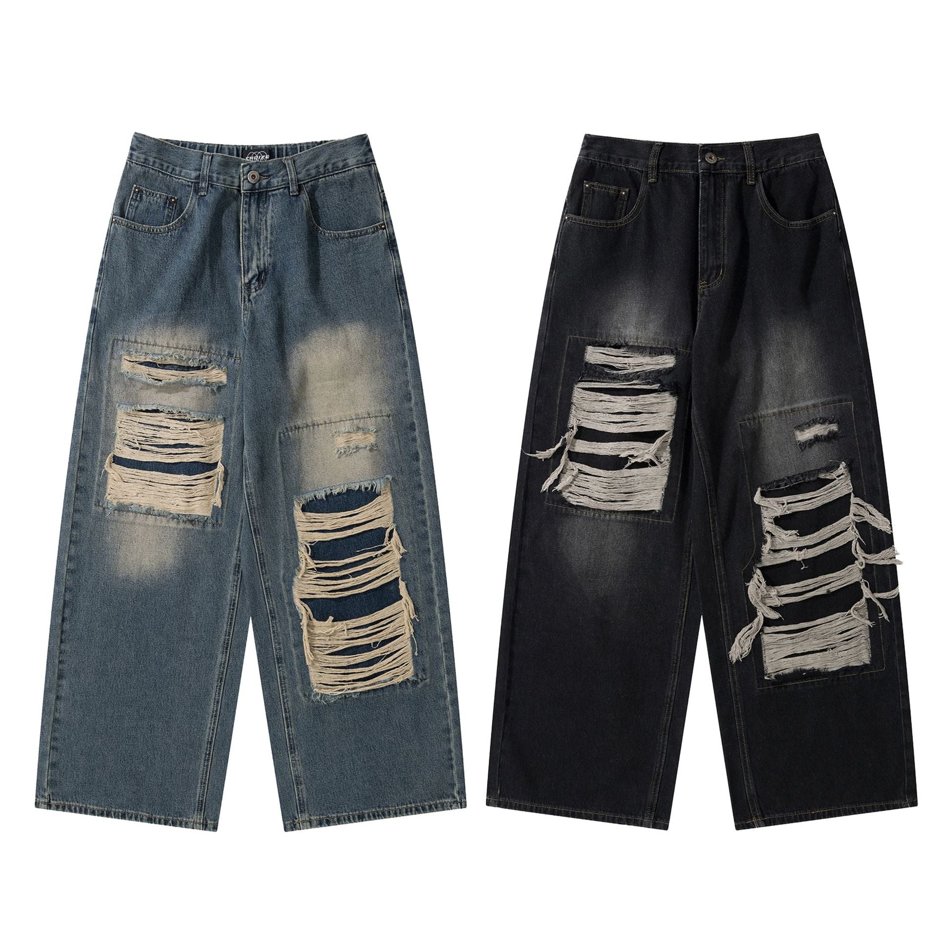 Ripped Denim Washed Tassel Loose Straight Leg Wide Leg Pants