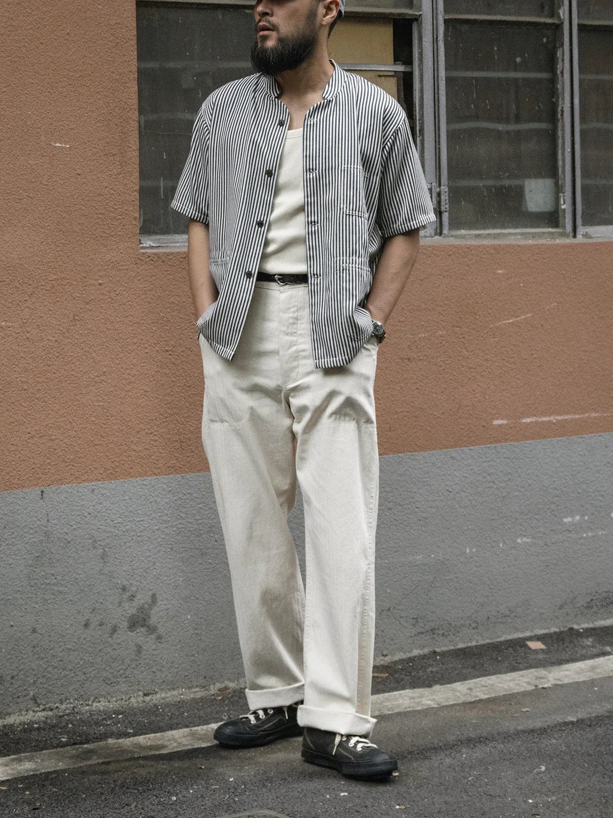 Rugged Hickory Stripe Short Sleeve Shirt Vintage Collarless Workshirt For Men