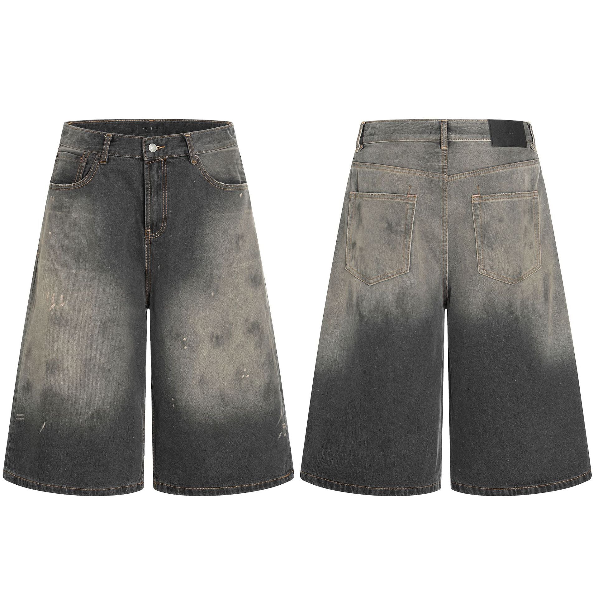 Seven-Quarter Denim Shorts with Faded Ink Splatter - Wide-Leg Fit