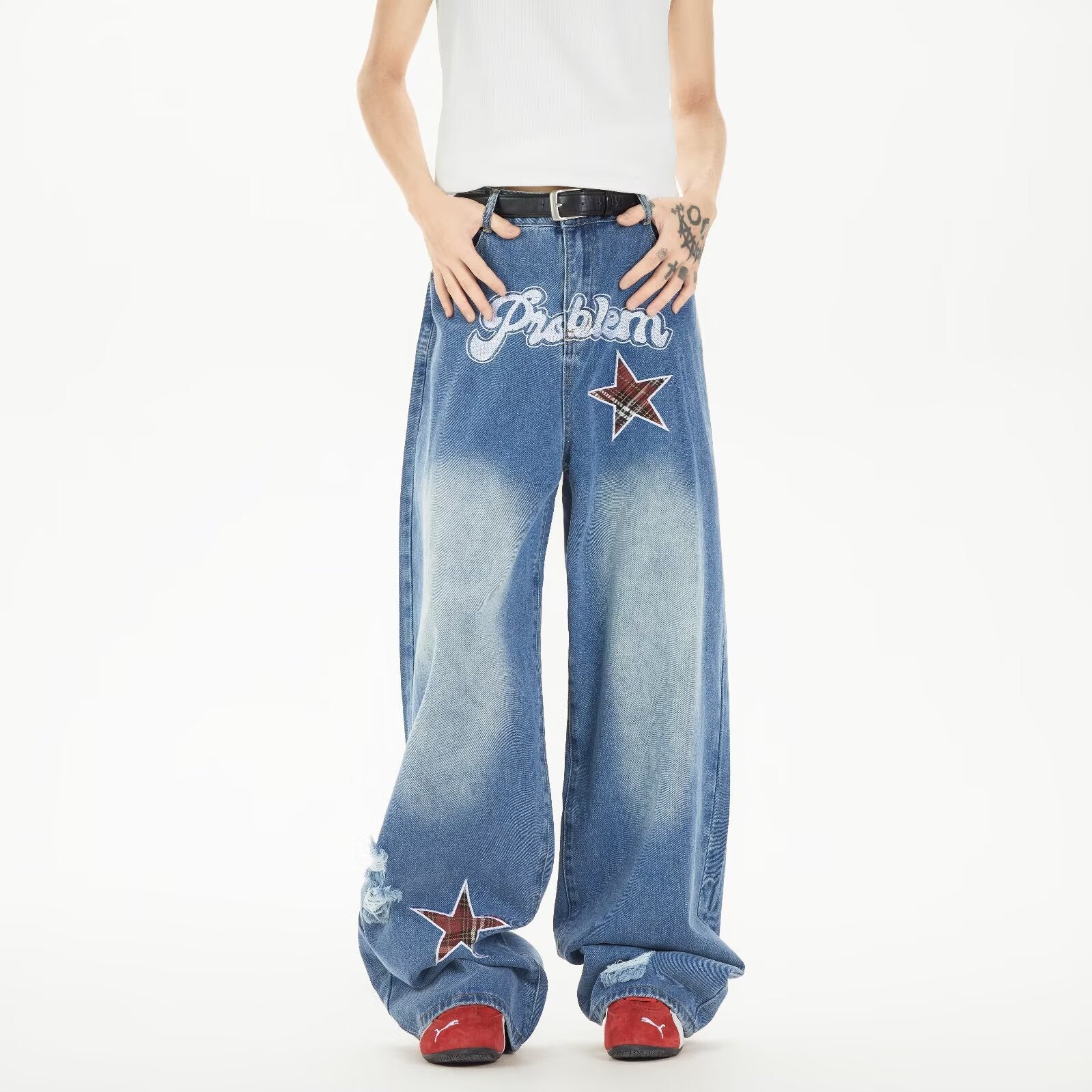 Star Embroidered Cowboy Loose Wide Leg Casual Pants