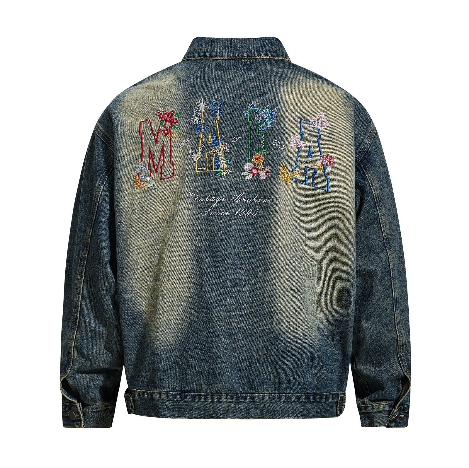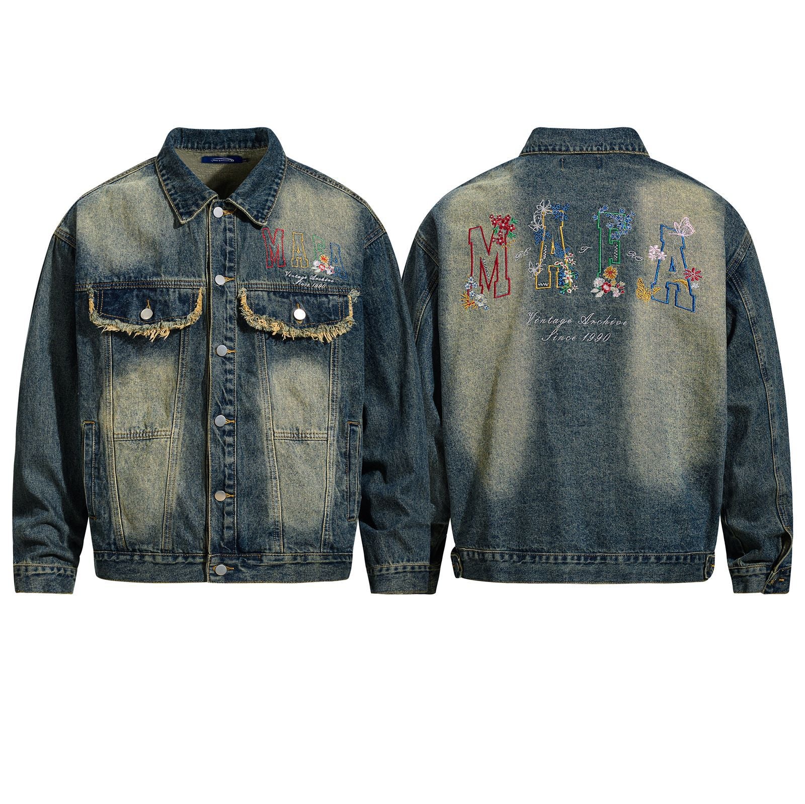 Style Washed Denim Jacket with Colorful Letter Embroidery