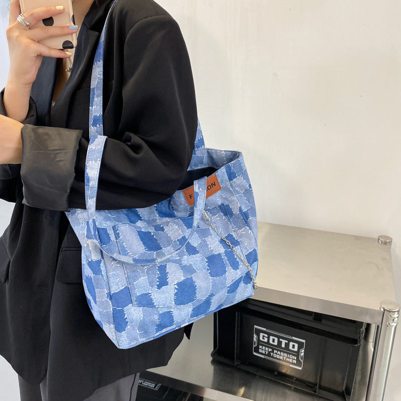 Introducing our stylish and modern one-shoulder tote bag, perfect for women who appreciate both fashion and functionality. Designed with a unique plaid denim pattern, this tote bag is not just a fashion statement but also a practical accessory for everyday use.