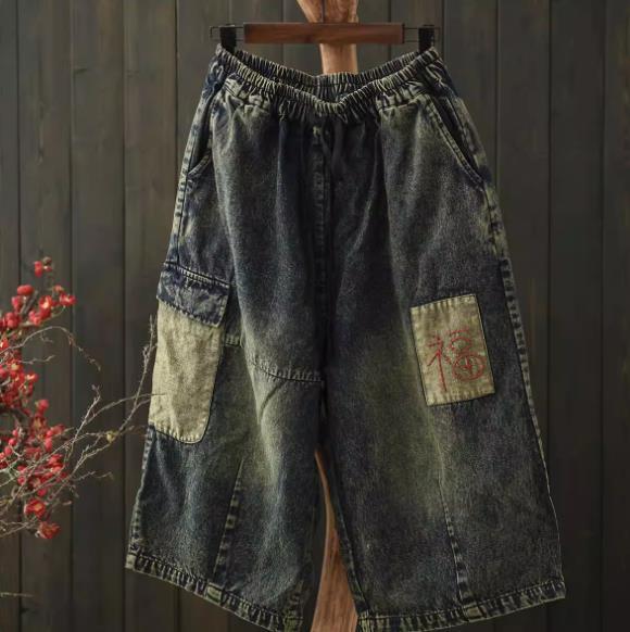 Discover a blend of style and comfort with our Vintage Embroidered Elastic Waist Distressed Denim Pants for Women. These loose wide leg capri trousers are perfect for those seeking a relaxed yet fashionable look.
