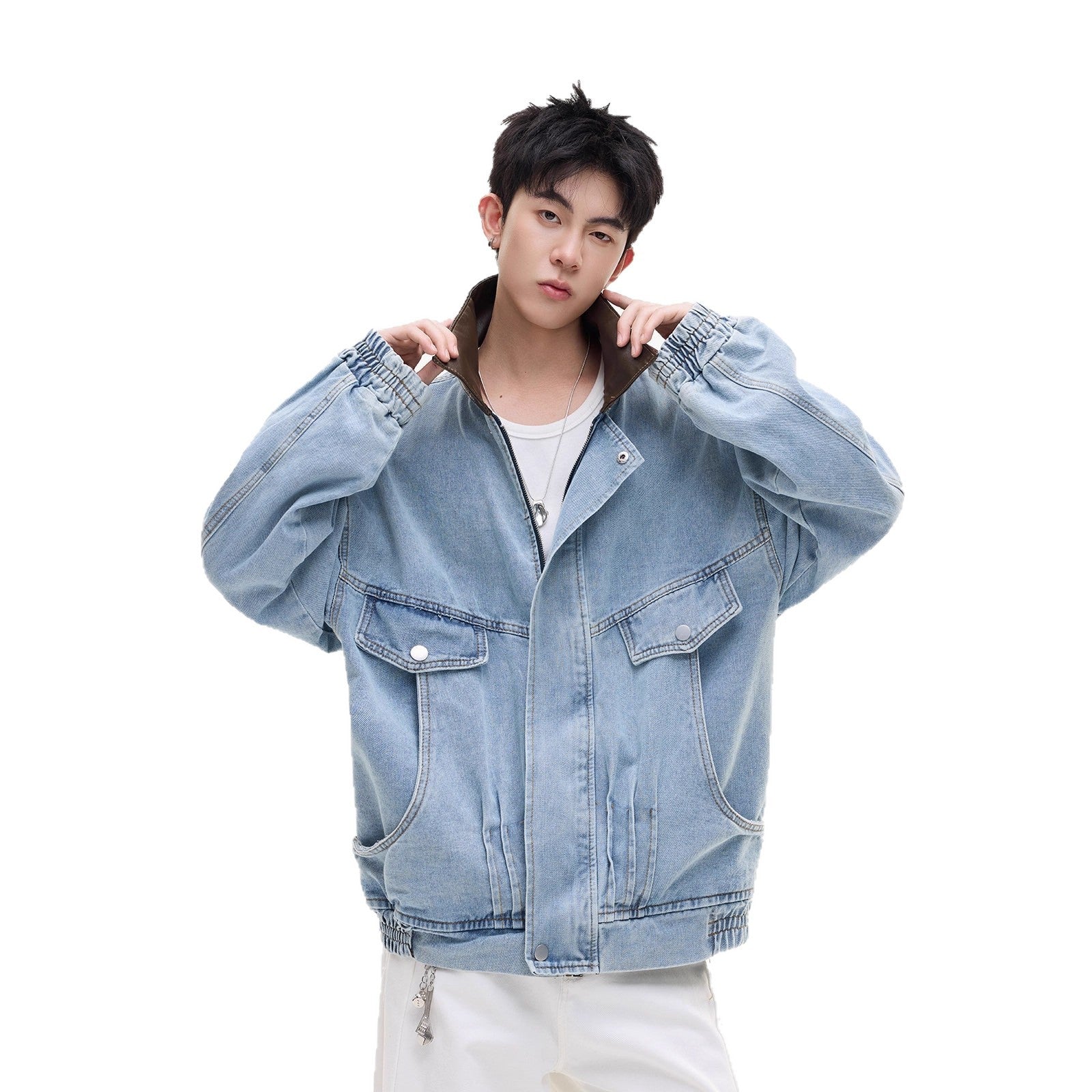 Washed Distressed Patchwork Leather Collar Denim Jacket Men