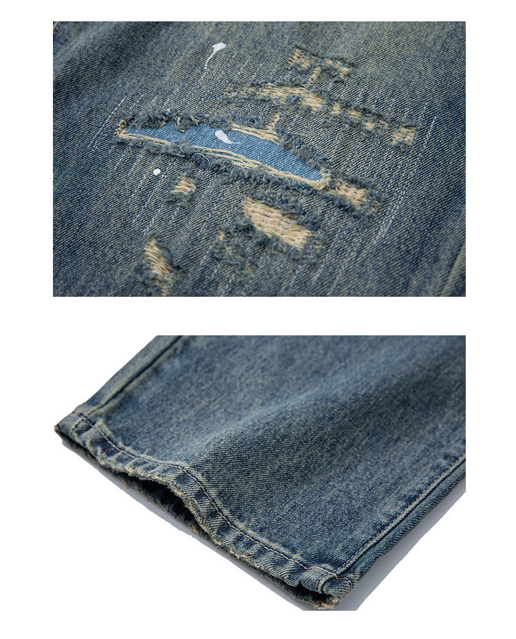 Washed Paint Splatter Patch Hole Catwhisker Straight Leg Jeans for Men