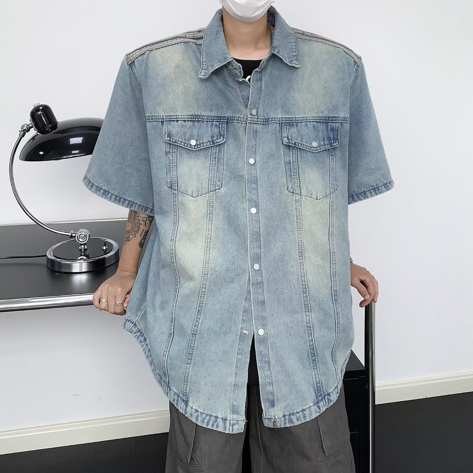 Washed Vintage Shoulder Padded Denim Shirt for Men