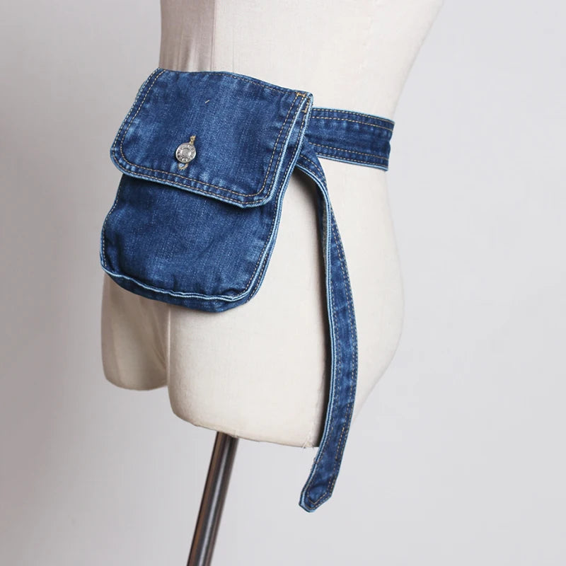 Discover the perfect blend of style and functionality with our Women's Blue Denim Pocket Purse Belt. This fashionable accessory is designed for both spring and autumn, making it a versatile addition to any outfit.
