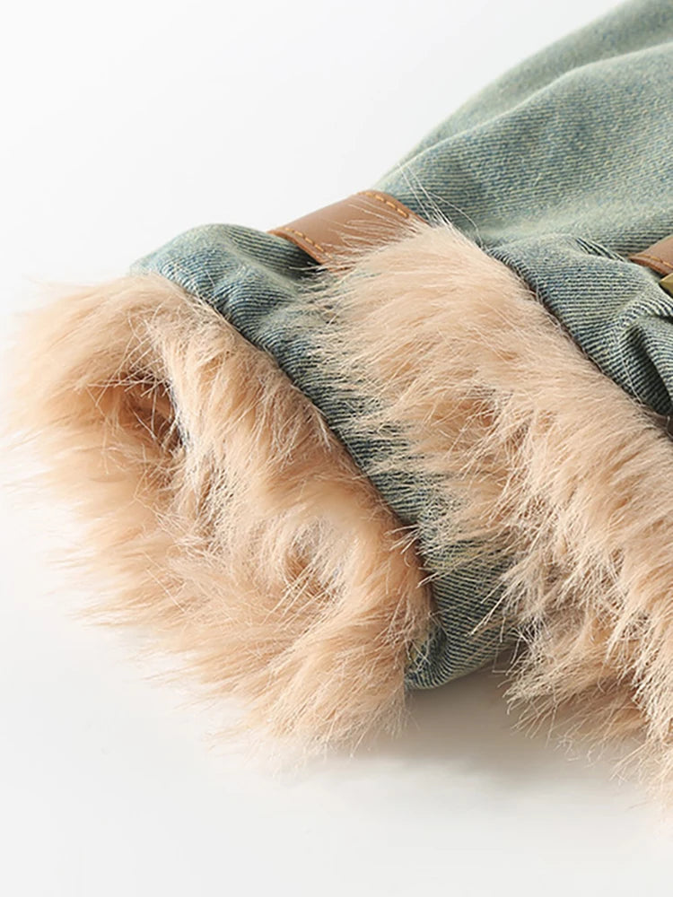 Women's Denim Coat with Stand Collar and Plush Cotton-Padded Lining