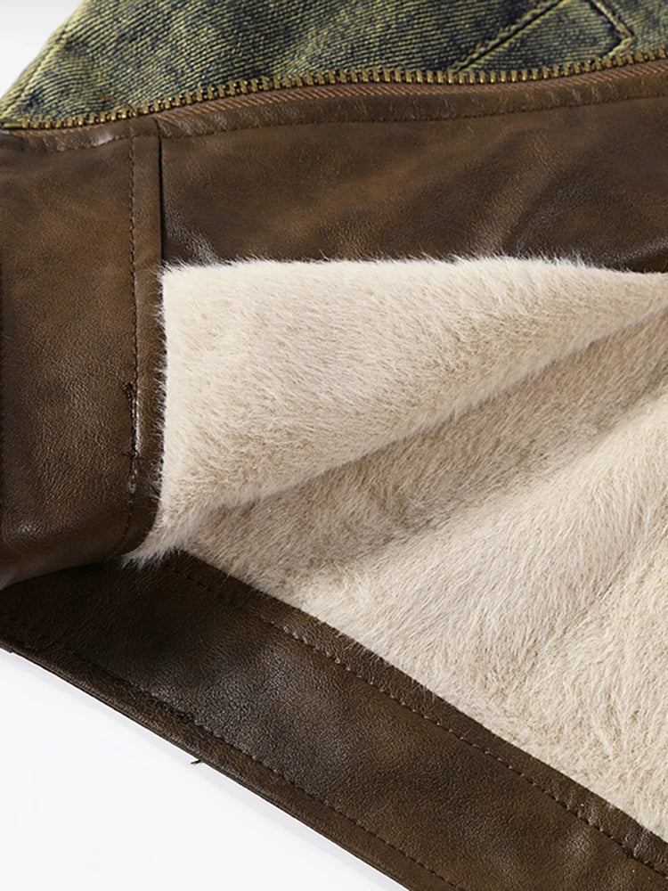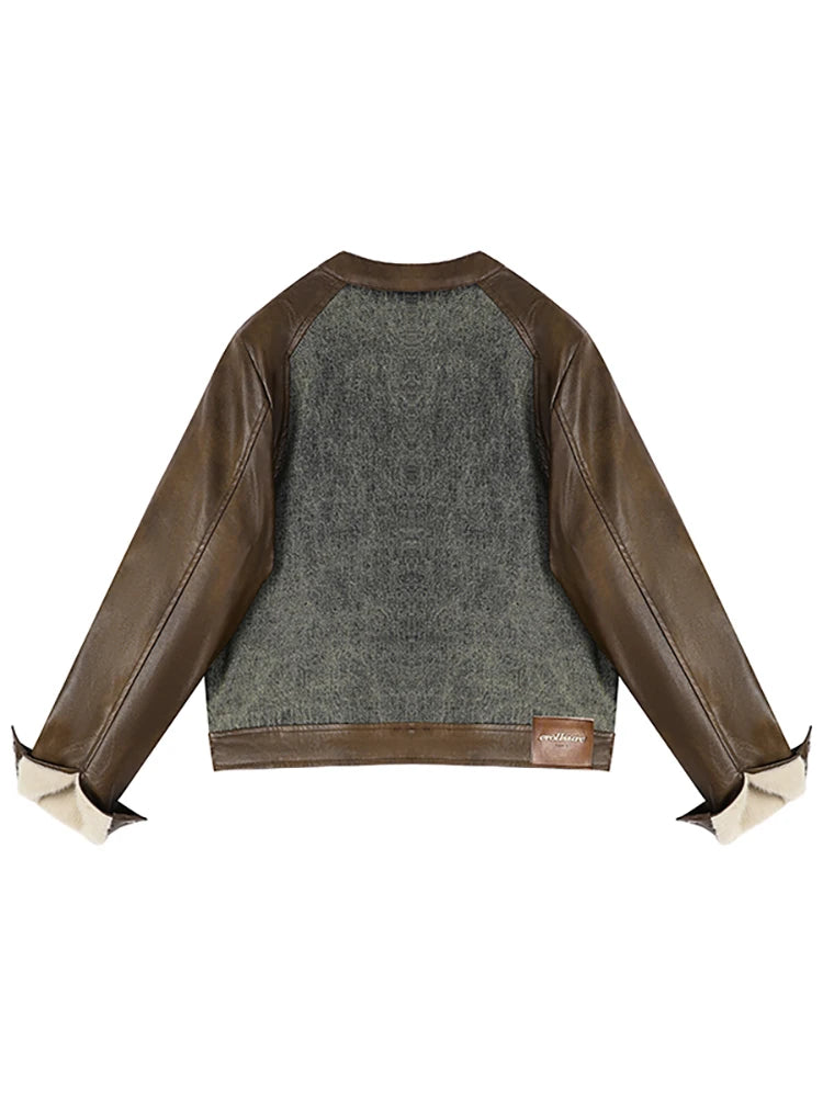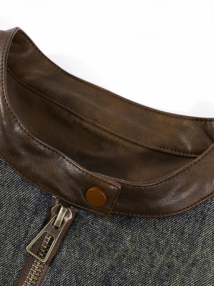 Women's Vintage Denim Biker Jacket with PU Leather Patchwork