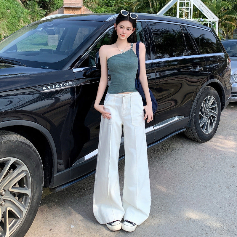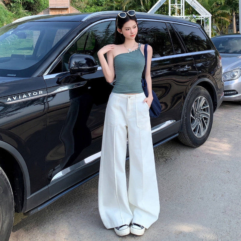 Women's Long Front Patch Pocket Design White Denim Pants Loose Wide Leg